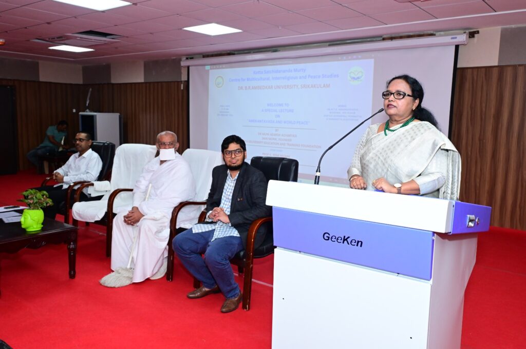 శ్రీకాకుళం, ఫిబ్రవరి 4 ఫ్లాష్ మెయిల్ న్యూస్ పబ్లికేషన్స్ : డాక్టర్ బి.ఆర్. అంబేద్కర్ విశ్వవిద్యాలయం లోని కొత్త సచ్చిదానంద మూర్తి బహుళ సాంస్కృతిక, అంతర్-మత మరియు శాంతి అధ్యయనాల కేంద్రం, అమెరికా లోని ఈక్యూ ఫర్ పీస్ వరల్డ్వైడ్ కలిసి, “అనేకాంతవాదం మరియు ప్రపంచ శాంతి” అనే అంశంపై సదస్సు నిర్వహించింది. నియంత్ ఎడ్యువర్సిటీ విద్య మరియు శిక్షణ ఫౌండేషన్ వ్యవస్థాపకులు, ప్రపంచ ప్రఖ్యాత జైన సన్యాసి డాక్టర్ ముని ఆదర్శ ఆచార్యజీ ముఖ్య ఉపన్యాసం ఇచ్చారు. తన ఉపన్యాసంలో, డాక్టర్ ముని ఆదర్శ ఆచార్యజీ సమకాలీన ప్రపంచ సంఘర్షణలను పరిష్కరించడంలో మరియు సంభాషణ, సహనం, సుస్థిర శాంతిని పెంపొందించడంలో బహుళ దృక్కోణాల జైన సిద్ధాంతమైన అనేకాంతవాదం యొక్క ఔచిత్యాన్ని అనర్గళంగా వివరించారు. ఈ కార్యక్రమానికి డాక్టర్ బి.ఆర్. అంబేద్కర్ విశ్వవిద్యాలయం వైస్-ఛాన్సలర్ ప్రొఫెసర్ కె. రెమి రజని విచ్చేసి, అంతర్-మత అవగాహన మరియు శాంతి అధ్యయనాలను ప్రోత్సహించడంలో విశ్వవిద్యాలయం యొక్క నిబద్ధతను నొక్కి చెప్పారు. ఈక్యూ ఫర్ పీస్ ఉపాధ్యక్షులు డాక్టర్ చల్లా కృష్ణవీర్ అభిషేక్, తాత్విక జ్ఞానాన్ని ఆచరణాత్మక శాంతి నిర్మాణ ప్రయత్నాలతో అనుసంధానించే సహకార ప్రపంచ కార్యక్రమాల ప్రాముఖ్యతను హైలైట్ చేశారు. డాక్టర్ బి.ఆర్. అంబేద్కర్ విశ్వవిద్యాలయం రిజిస్ట్రార్ ప్రొఫెసర్ బి. అడ్డాయి, విశ్వవిద్యాలయ విద్యార్థులలో సానుకూల మానసిక ఆరోగ్యం, సుస్థిర ఆనందం మరియు అంతర్గత శాంతిని ప్రోత్సహించడానికి నియంత్ ఎడ్యువర్సిటీతో ఒక అవగాహన ఒప్పందంపై సంతకం చేశారు. అధ్యయనాల కేంద్రం డైరెక్టర్ డాక్టర్ సంతోష్ రంగనాథన్ స్వాగతోపన్యాసం చేసారు.