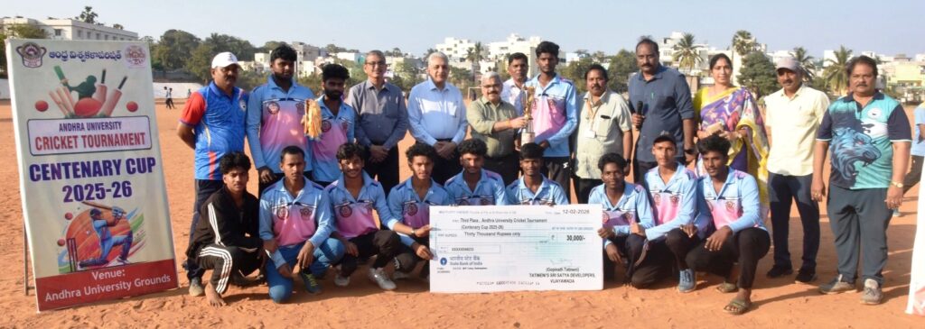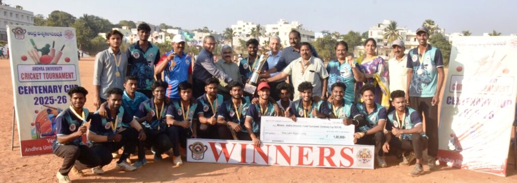 విశాఖ ఎడ్యుకేషన్,ఫిబ్రవరి 12 ఫ్లాష్ మెయిల్ న్యూస్ పబ్లికేషన్స్ : విద్యార్థులు క్రిడల్లో పాల్గొనడం వలన ఉత్సాహాన్ని ఇస్తాయని ఏయూ వైస్ ఛాన్సలర్ ఆచార్య జీపి రాజశేఖర్ అన్నారు. గురువారం ఏయూ క్రీడామైదానంలో ఆట్టహాసంగా సెంటనరీ క్రికెట్ పైనల్ పోటీలు జరిగాయి. ఈసందర్భంగా మాట్లాడుతూ ఈ క్రికెట్ పోటీల్లో విజేతలకు ప్రైజ్ మానిని స్పాన్సర్ అందించి న వారికీ అభినందనలు తెలిపారు. ఈ ఫైనల్ పోటీలు డాక్టర్ లంకపల్లి బుల్లయ్య కళాశాలకు జిడిసీ గుమ్మ లక్ష్మీ పురం కు జరిగాయి. టాస్ బుల్లయ్య కళాశాల టాస్ గెల్చి ఫీల్డింగ్ ను ఎన్నుకుంది. గవర్నమెంట్ డిగ్రీ కళాశాల (జిడిసి) బ్యాటింగ్ దిగి 10 ఓవర్లు ఆడి 5 వికెట్లు నష్టానికి 56 పరుగులు చేసారు. అనంతరం బ్యాటింగ్ దిగిన డాక్టర్ బుల్లయ్య కళాశాల జట్టు 10 ఓవర్లు ఆడి 8 వికెట్లు కోల్పోయి 57 పరుగులు చేసారు. ఈ మ్యాచ్ డాక్టర్ లంకపల్లి బుల్లయ్య కళాశాల ఏయూ శాతాబ్ది క్రికెట్ ఛాంపియన్ షిప్ కైవసం చేసుకుంది. ఉదయం డాక్టర్ ఎల్ బి కళాశాలకు ఎంవీఆర్ కాలేజీ కి మ్యాచ్ జరిగింది. ఈ మ్యాచ్ లో డాక్టర్ ఎల్ బి కళాశాల విజేతగా నిల్చింది. మరో మ్యాచ్ గుమ్మ లక్ష్మీ పురంకు ఎంవీఆర్ కాలేజీ కి మ్యాచ్ జరిగింది. ఈ మ్యాచ్ లో గుమ్మలక్ష్మీపురం జీడీసీ విజేతగా నిల్చి ఫైనల్స్ చేరింది. పైనల్స్ లో డాక్టర్ బుల్లయ్య కళాశాల నిల్చింది. మూడవ స్థానం జాయింట్ విన్నర్స్ గా ఎఎంఎల్ కళాశాల, ఎంవిఆర్ కళాశాల నిల్చాయి. వీరికి వైస్ ఛాన్సలర్ 30 వేల రూపాయలు చొప్పున ప్రైజ్ మణీని అందించారు. అలాగే విన్నర్స్ బుల్లయ్య కళాశాలకు లక్షరూపాయలు, రన్నర్స్ గుమ్మలక్ష్మీపురం జిడీసీ కి 50 వేల రూపాయలు ప్రైజ్ మణీని అందించారు. ఈ ప్రైజ్ మణీ స్పాన్సర్స్ యుఎస్ఎ నరవనేని సత్యంబాబు 3 లక్షల రూపాయలు తాతినేని గోపీ 2 లక్షల రూపాయలు అందించగా సెంటనరీ క్రికెట్ పోటీలుకు వినియోగించినట్లు ఏయూ డైరెక్టర్ ఆఫ్ ఫిజికల్ ఎడ్యుకేషన్ ఆచార్య ఎన్. విజయమోహన్ తెలిపారు. డాక్టర్ లంకపల్లి బుల్లయ్య కళాశాల సెక్రటరీ డాక్టర్ జి. మధుకుమార్, ప్రిన్సిపల్ డాక్టర్ జి.ఎస్.కె. చక్రవర్తి. ఏయూ వ్యాయామ విద్యా విభాగం హెడ్ ఆచార్య ఎ. పల్లవి, చీఫ్ సెక్ర్యూరిటీ ఆఫీసర్ ప్రొఫెసర్ ఆశా ఇమ్మానియాల్ రాజ్, ప్రొఫెసర్ యుగంధర్, డాక్టర్ వై. శ్రీనివాసరావు, డాక్టర్ లక్ష్మరెడ్డి, ఎఎంఎల్ కళాశా కళాశాల పీడీ డాక్టర్ నాయుడు, ఎంవిఆర్ కళాశాల పీడీ రవికుమార్, పీడీ శ్రీకాంత్, పరిశోధకులు, ఎంపీఈడీ విద్యార్థులు ఆఫీసియల్స్ జి. అప్పారావు, లోకేష్, మోహన్ తదితరులు పాల్గొన్నారు.చీఫ్ సెక్ర్యూరిటీ ఆఫీసర్ ప్రొఫెసర్ ఆశా ఇ మ్మానియాల్ రాజ్, ప్రొఫెసర్