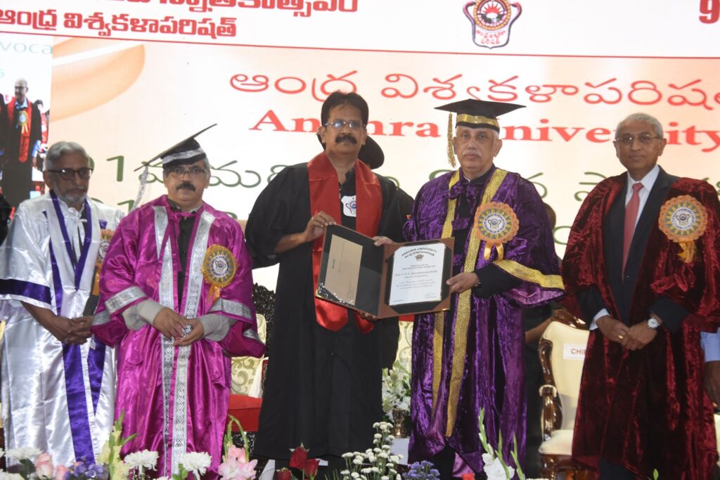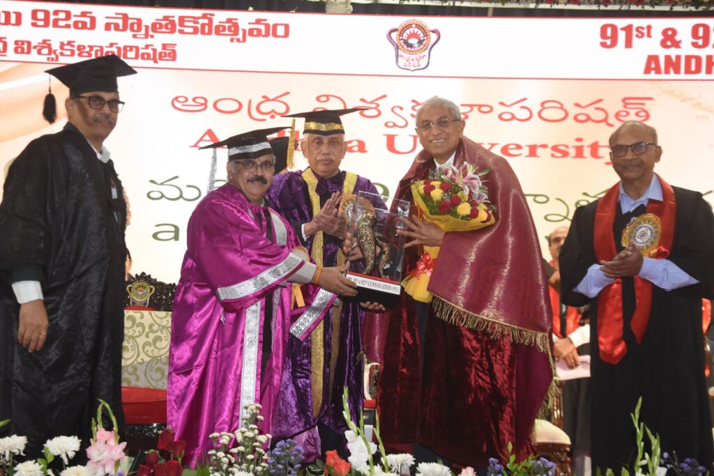 డిగ్రీ సాధన ముగింపు కాదని కొత్త ప్రయాణానికి ఆరంభంని అన్నారు. విద్యార్థులను ఉద్దేశించి మాట్లాడుతూ డిగ్రీ సాధన ఒక ముగింపు కాదు, కొత్త ప్రయాణానికి ఆరంభమని గవర్నర్ అబ్దుల్ నజీర్ పేర్కొన్నారు. ఆత్మవిశ్వాసం, కష్టపడే తత్వం, నైతిక విలువలతో ముందుకు సాగితే ఏ లక్ష్యాన్నైనా సాధించవచ్చని సూచించారు. విశ్వవిద్యాలయ ప్రాంగణాల్లో రాజకీయాలకు దూరంగా ఉండి విద్య, వ్యక్తిత్వ వికాసంపై దృష్టి పెట్టాలని హితవు పలికారు. చివరిగా, పట్టాలు, పతకాలు అందుకున్న విద్యార్థులందరికీ అభినందనలు తెలియజేస్తూ వారు సమాజానికి ఉపయోగపడే బాధ్యతాయుత పౌరులుగా ఎదగాలని ఆకాంక్షించారు. పూర్ణచంద్రరావు సగ్గుర్తి, తల్లావజ్జల పతంజలి శాస్త్రిలకు డాక్టరేట్ అవార్డుల ప్రదానం కార్యక్రమంలో భాగంగా ఏయూ పూర్వ విద్యార్థి, బ్యాంక్ ఆఫ్ అమెరికా వైస్ చైర్మన్ డాక్టర్ పూర్ణచంద్రరావు సగ్గుర్తికి, కేంద్ర సాహిత్య అకాడమీ అవార్డు గ్రహీత తల్లావజ్జల పతంజలి శాస్త్రిలకు గవర్నర్ చేతుల మీదుగా అవార్డులను ప్రదానం చేశారు. వీరితో పాటు జియో, సివిల్ ఇంజనీరింగ్ విభాగాలకు చెందిన ప్రొ. పి. జగదీశ్వరరావు, ప్రొ. సి.ఎన్.వి. సత్యనారాయణ రెడ్డిలకు బెస్ట్ రీసెర్చ్ అవార్డులు అందజేశారు. ఫ్యాకల్టీ ఆఫ్ ఆర్ట్స్ విభాగం నుంచి ఎనిమిది మంది ఫ్యాకల్టీ ఆఫ్ లా నుంచి ఇద్దరు, ఫ్యాకల్టీ ఆఫ్ సైన్స్, ఇంజనీరింగ్, ఫార్మాస్యూటికల్ సైన్స్స్ నుంచి ఏడుగురు మొత్తం 17 మంది రీసెర్చ్ మెడల్స్ అందుకున్నారు. ఇదే క్రమంలో 13 మంది రీసెర్చ్ ప్రైజ్లు, ఏడుగురు ఎం.ఫిల్ డిగ్రీలను, 441 మంది పీహెచ్డీ డిగ్రీలను తీసుకున్నారు. యూజీ పీజీ మెడల్స్ 174, యూజీ పీజీ ప్రైజులు 437, మెత్తం యూజీ పీజీ ప్రైజులు, మెడల్స్ 148 మంది అతిథుల చేతుల మీదుగా స్వీకరించారు. ప్రపంచ ఆర్థిక రంగంలో భారత్కు అపార అవకాశాలు : డాక్టర్ పూర్ణ చంద్రరావు సగ్గుర్తి ప్రపంచ ఆర్థిక వ్యవస్థలో భారత్ వేగంగా ఎదుగుతూ కీలక స్థానాన్ని సంపాదించుకుంటోందని, రాబోయే సంవత్సరాల్లో ప్రపంచంలో మూడవ అతిపెద్ద ఆర్థిక శక్తిగా అవతరించే అవకాశాలు ఉన్నాయని బ్యాంక్ ఆఫ్ అమెరికా వైస్ ఛైర్మన్, ఆంధ్ర విశ్వవిద్యాలయ పూర్వ విద్యార్థి డాక్టర్ పూర్ణ చంద్రరావు సగ్గుర్తి పేర్కొన్నారు. ఆంధ్ర విశ్వవిద్యాలయం స్నాతకోత్సవంలో గౌరవ డాక్టరేట్ స్వీకరించిన అనంతరం ఆయన మాట్లాడుతూ ప్రస్తుత గ్లోబల్ ఆర్థిక పరిస్థితుల్లో భారత్ 7.5 శాతం వృద్ధి రేటుతో ముందుకు సాగుతూ ప్రపంచ దృష్టిని ఆకర్షిస్తోందన్నారు. ప్రపంచవ్యాప్తంగా ఆర్థిక రంగంలో మారుతున్న పరిస్థితులకు అనుగుణంగా భారత యువత తమ నైపుణ్యాలను పెంపొందించుకోవాల్సిన అవసరం ఉందని సూచించారు. బ్యాంక్ ఆఫ్ అమెరికా ప్రపంచ ఆర్థిక వ్యవస్థలో అగ్రగామి సంస్థగా నిలుస్తోందని, ఆస్తుల పరం