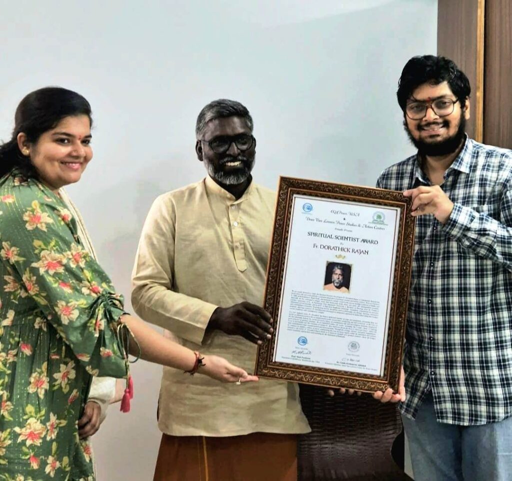 విశాఖపట్నం,ఏప్రిల్ 9 ఫ్లాష్ మెయిల్ న్యూస్ పబ్లికేషన్స్: బెనెడిక్టిన్ సన్యాసి, శాంతివనం సచ్చిదానంద ఆశ్రమ ప్రియర్ ఫాదర్ దొరథిక్ రాజన్ కి ఆధ్యాత్మిక పరిశోధన మరియు శాంతి స్థాపనలో చేసిన విశిష్ట సేవలకు గుర్తింపుగా “స్పిరిచువల్ సైంటిస్ట్ అవార్డు” ప్రదానం చేశారు. ఈ పురస్కారాన్ని అమెరికా లోని ఈ క్యూ ఫర్ పీస్ ఉపాధ్యక్షుడు మరియు డీన్ వాన్ ల్యూవెన్ సెంటర్ ఫర్ పీస్ స్టడీస్ ఎగ్జిక్యూటివ్ డైరెక్టర్ ప్రొఫెసర్ డా. చల్లా కృష్ణవీర్ అభిషేక్ విశాఖపట్నంలోని సెంటర్ ఫర్ ఎమోషనల్ ఎడ్యుకేషన్ సొసైటీలో జరిగిన కార్యక్రమంలో అందజేశారు. ఫాదర్ రాజన్ అంతర్ముఖ శాంతి మరియు గ్లోబల్ హార్మనీపై చేసిన వినూత్న పరిశోధనలకు ఈ అవార్డు అందుకున్నారు. ముఖ్యంగా క్రైస్తవ మిస్టిసిజం, క్రైస్ట్ కాన్షస్నెస్ మరియు భారతీయ జ్ఞాన వ్యవస్థల మధ్య సంబంధాన్ని అధ్యయనం చేస్తూ, ఆధ్యాత్మికతను శాస్త్రీయ మరియు అనుభవాత్మక దృక్పథంతో వివరించిన ఆయన కృషి విశేషంగా ప్రశంసించబడింది. ఈ సత్కారం ద్వారా వివిధ ఆధ్యాత్మిక సంప్రదాయాల మధ్య సంభాషణను పెంపొందించడం, మరియు విశ్వమానవ సమన్వయం, ఆత్మసాక్షాత్కారం దిశగా ఆయన చేస్తున్న కృషి కి గుర్తింపుగా ఈ పురస్కారం అందించబడింది.