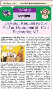 Bhavana Hemavani receive Ph.D in Department of Civil Engineering AU ఆంధ్రప్రదేశ్ November 8, 2025November 18, 2025ChukkalaLeave a Comment on Bhavana Hemavani receive Ph.D in Department of Civil Engineering AU